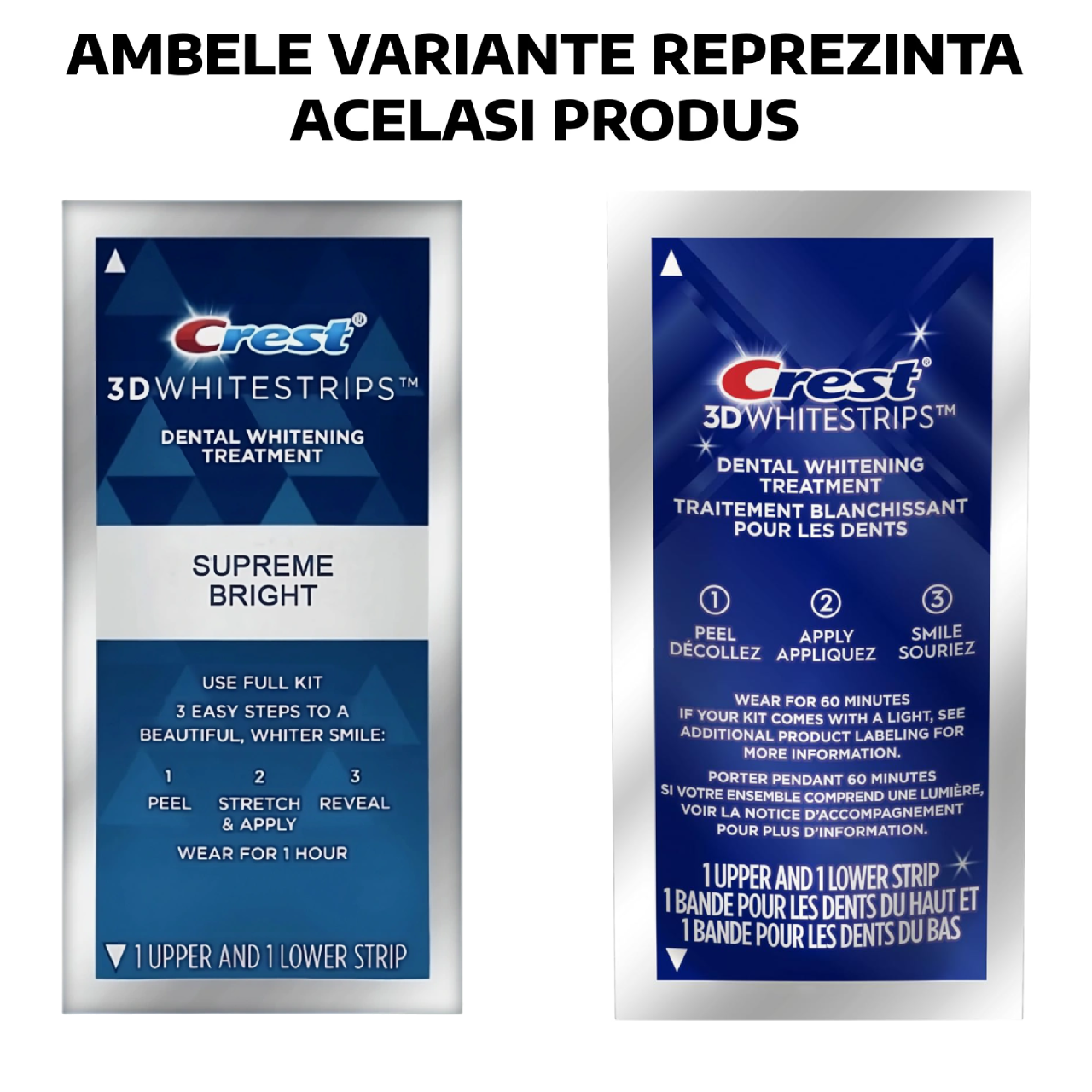 Descoperă acum puterea albirii dentare cu benzi Crest 3D Supreme Bright și bucură-te de un zâmbet alb și strălucitor!