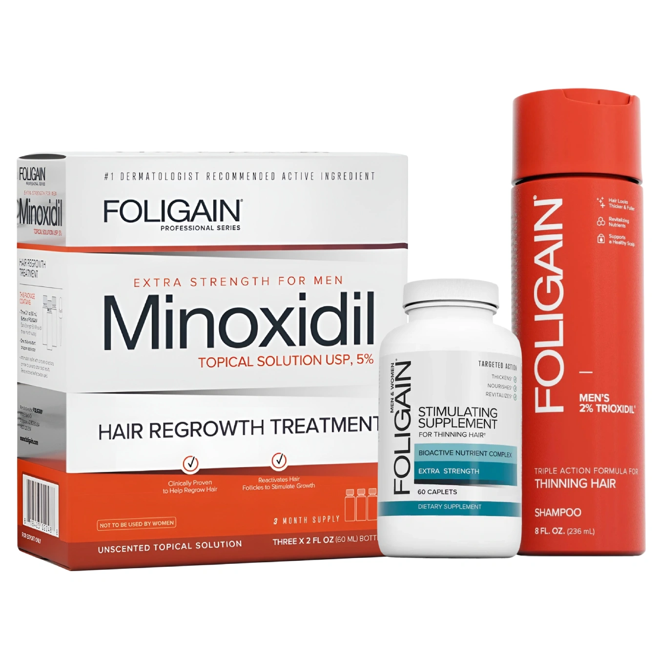 Pachetul FOLIGAIN pentru bărbați este un kit 3-în-1 creat pentru a combate căderea părului, a stimula regenerarea firelor subțiate și a susține creșterea bărbii. Rutină simplă, eficientă și ușor de integrat zilnic, ideală pentru cei care își doresc un păr mai des și o barbă mai plină.